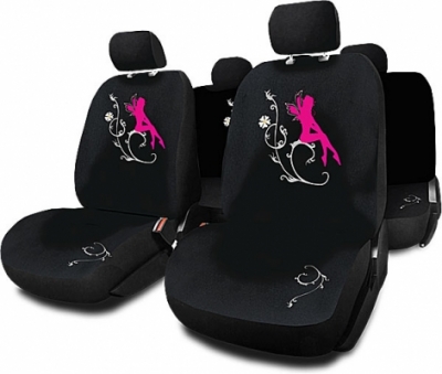 Материал: велюр, вышивка.  Комплект: 2 чехла на передние сидения, чехол на заднее сидение, 5 чехлов для подголовников.