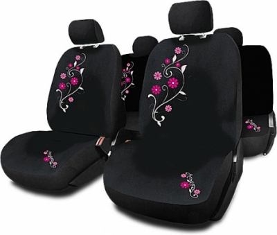 Материал: велюр, вышивка.  Комплект: 2 чехла на передние сидения, чехол на заднее сидение, 5 чехлов для подголовников.