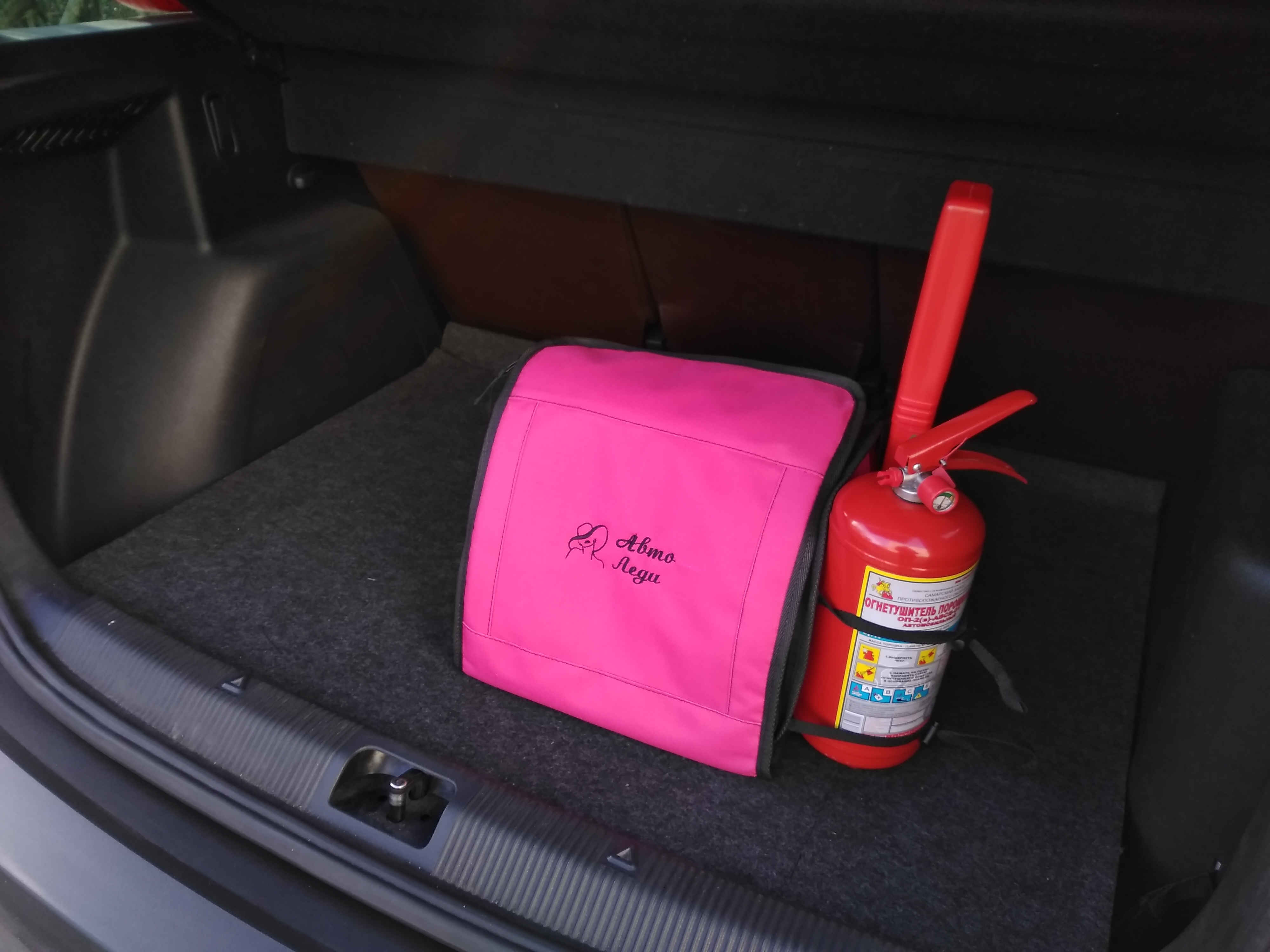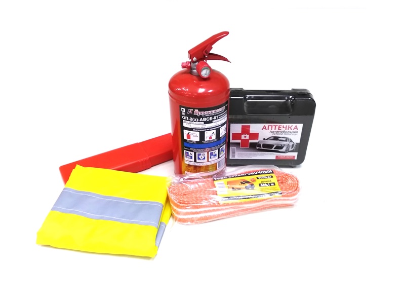 •    Комплектация: органайзер для автопринадлежностей с стропы для внешнего крепления огнетушителя, аптечка автомобильная нового образца, огнетушитель ОП-2 с манометром, знак аварийной остановки, жилет светоотражающий, трос буксировочный 5 тонн, перчатки хлопчатобумажные, плащ-дождевик на липучке.