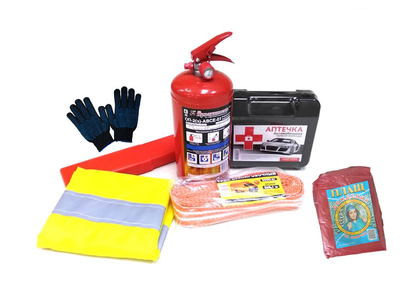 •    Комплектация: органайзер для автопринадлежностей с стропы для внешнего крепления огнетушителя, аптечка автомобильная нового образца, огнетушитель ОП-2 с манометром, знак аварийной остановки, жилет светоотражающий, трос буксировочный 5 тонн, перчатки хлопчатобумажные, плащ-дождевик на липучке.