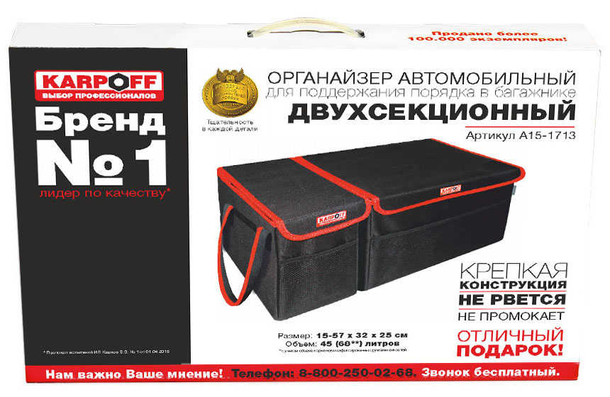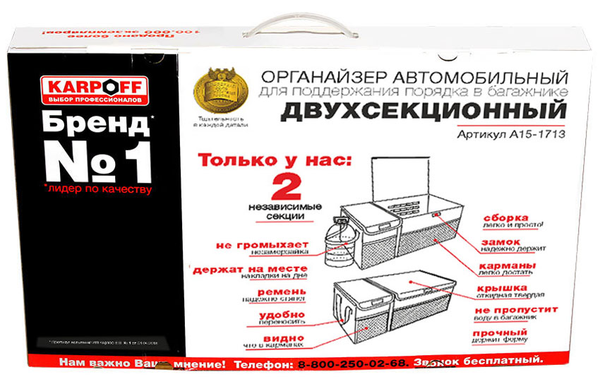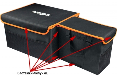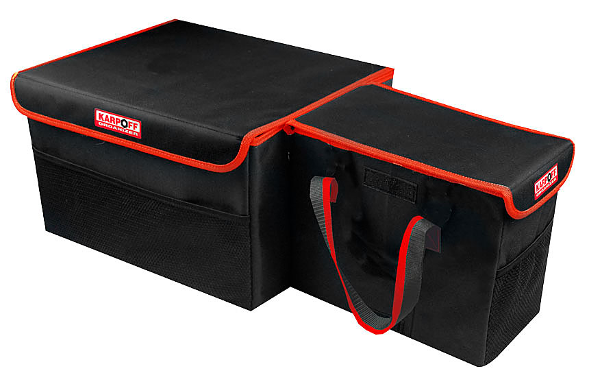 • Опции: Состоит из двух независимых емкостей с крышками,позволяет навести порядок в багажнике, каждую отдельную емкость можно использовать самостоятельно или соединив с другой. При трансформации складывающиеся стенки фиксируются липучками.Покрытие изготовлено из прочного износостойкого материала. Внешние карманы удобны для хранения часто используемых предметов (перчатки, инструмент и пр.). Удобные ручки для переноски и для фиксации различных емкостей во время движения автомобиля, емкость - 45 литров. Нескользящее дно с липучками.