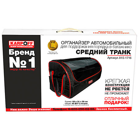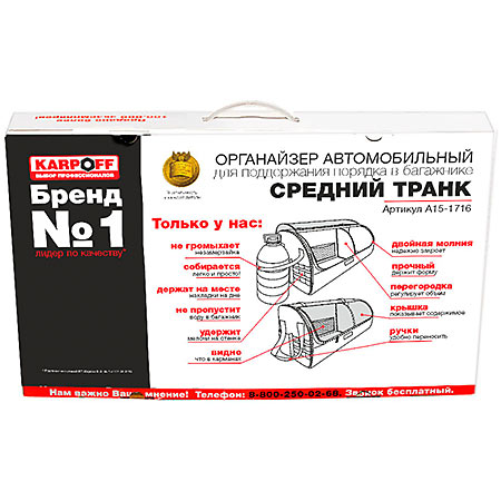 • Опции: Состоит из прочного, практичного и водонепроницаемого полиэстера. Основа стенок - легкий и прочный сотовый поликарбонат. Легко собирается и складывается. Замки на молнии. При необходимости увеличить объем, внутренняя перегородка может убираться к задней стенке. Прозрачная крышка фиксируется молнией. Внешние карманы удобны для хранения часто используемых предметов (перчатки, инструмент и пр.). Удобные ручки для переноски и для фиксации различных емкостей во время движения автомобиля, 10 наружных и внутренних карманов, емкость - 45 литров. Покрытие изготовлено из прочного износостойкого материала, нескользящее дно с липучками.