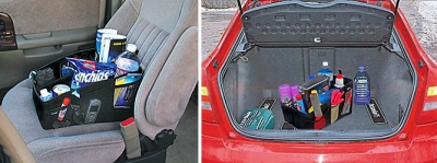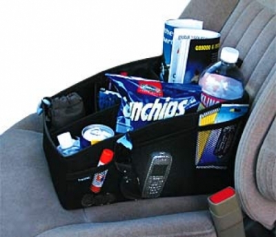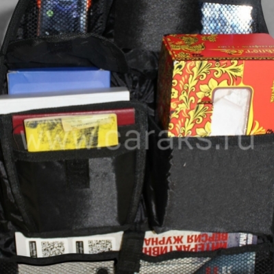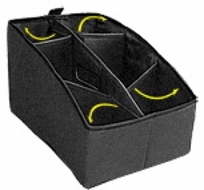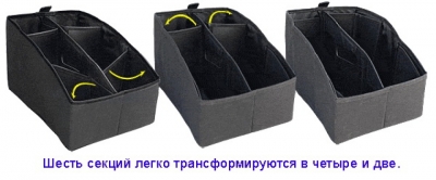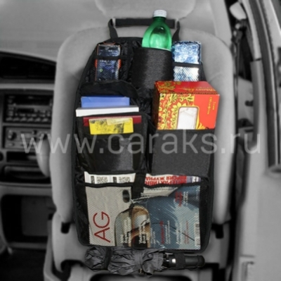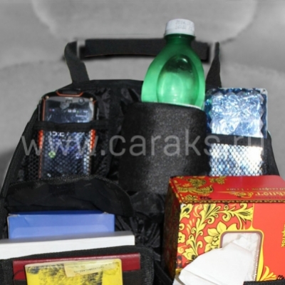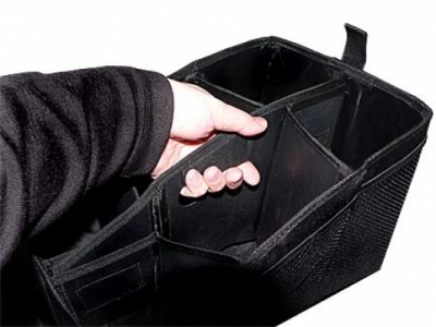 Устанавливается на сидение или центральную консоль автомобиля. Удобен для хранения напитков в больших и маленьких бутылках и банках, салфеток, карты и прочих необходимых мелочей. Трансформируемые пререгородки позволяют сформировать от 2-х до 6 отсеков. Три сетчатых кармана на боковой стенке и один сетчатый карман на стенке внутри органайзера. На центральной перегородке есть ручка для переноски. Допускается использование в багажнике, при наличии возможности надежного крепления. Размер 35см/53см/46см