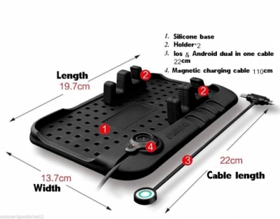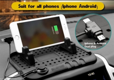 • Описание товара: нескользящий силиконовый коврик на торпедо с зарядным устройством, подходит для зарядки большинства современных мобильных телефонов и планшетов, подключается к бортовой сети через USB-разъем