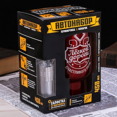 • Комплектация: термокружка  из нержавеющей стали и пластика для горячих и холодных напитков, работает от автомобильного прикуривателя, крышка-непроливайка с клапаном, подходит для стандартных автомобильных подстаканников, салфетка из микрофибры, светодиодный фонарик.