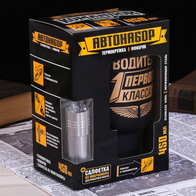 • Комплектация: термокружка  из нержавеющей стали и пластика для горячих и холодных напитков, работает от автомобильного прикуривателя, крышка-непроливайка с клапаном, подходит для стандартных автомобильных подстаканников, салфетка из микрофибры, светодиодный фонарик.