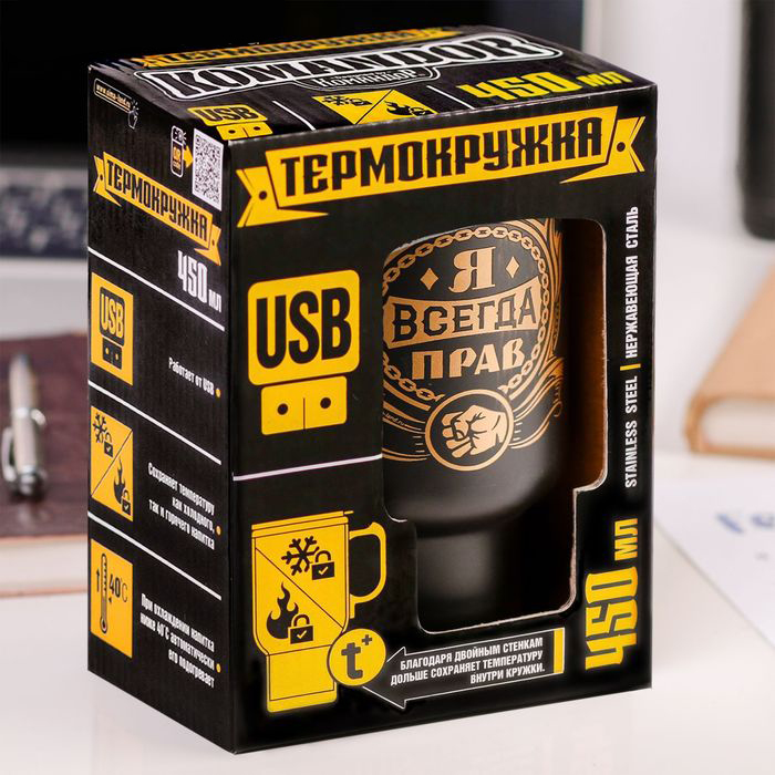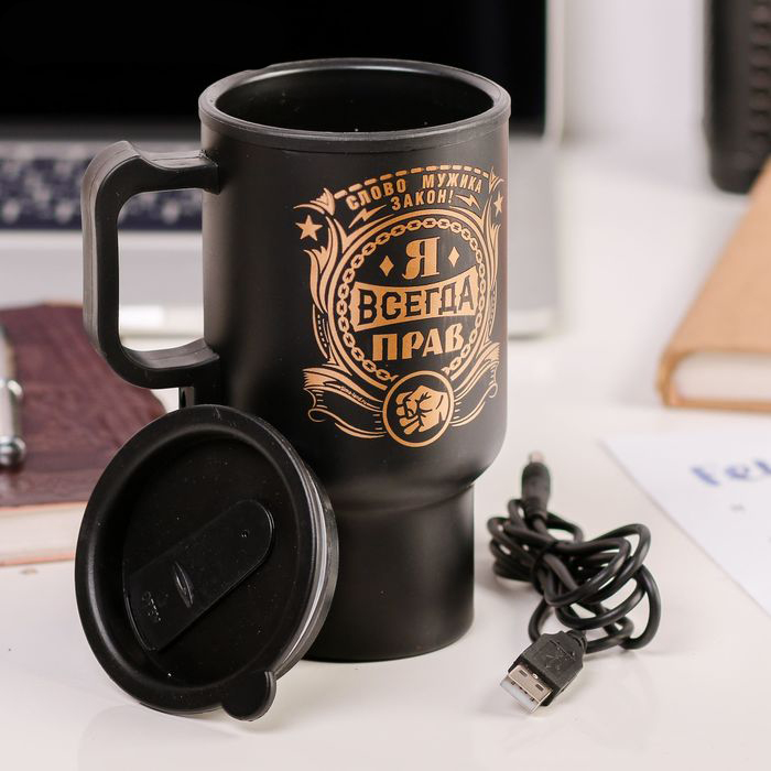 • Комплектация: термокружка  из нержавеющей стали и пластика для горячих и холодных напитков, работает от USB разъема в автомобиле, компьютере или ноутбуке (провод в комплекте), крышка-непроливайка с клапаном, подходит для стандартных автомобильных подстаканников.