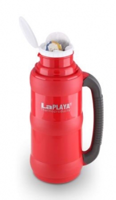 Корпус термоса LaPlaya Traditional dark red (1 литр) изготовлен из качественного пластика, а колба - из надежного стекла. Имеется удобная крышка с завинчивающейся пробкой, которая одновременно является контейнером, куда можно положить пакетики чая, кофе, сахар, сухое молоко. Пробка оснащена желобом для того, чтобы можно было выливать напиток без вывинчивания пробки. Кроме того, крышка разъединяется, образуя две чашки с ручками. Термос имеет прорезиненную ручку для надежного захвата, исключающего скольжение.