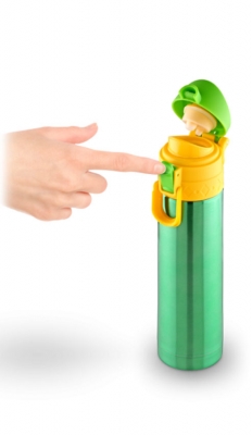 - для начала опустите вниз кольцо-предохранитель; - затем переместите в верхнее положение фиксатор термоса (система защиты); - нажатием на фиксатор откройте крышку (пробка при этом откидывается);