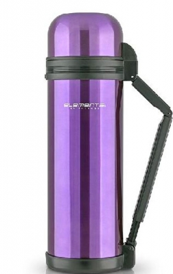 Вместительный термос с откидной ручкой. Сделан (колба и корпус) из нержавеющей стали, есть наплечный ремень. Пробка закручивается, есть направляющая для наливания. Горло термоса комбинированное.